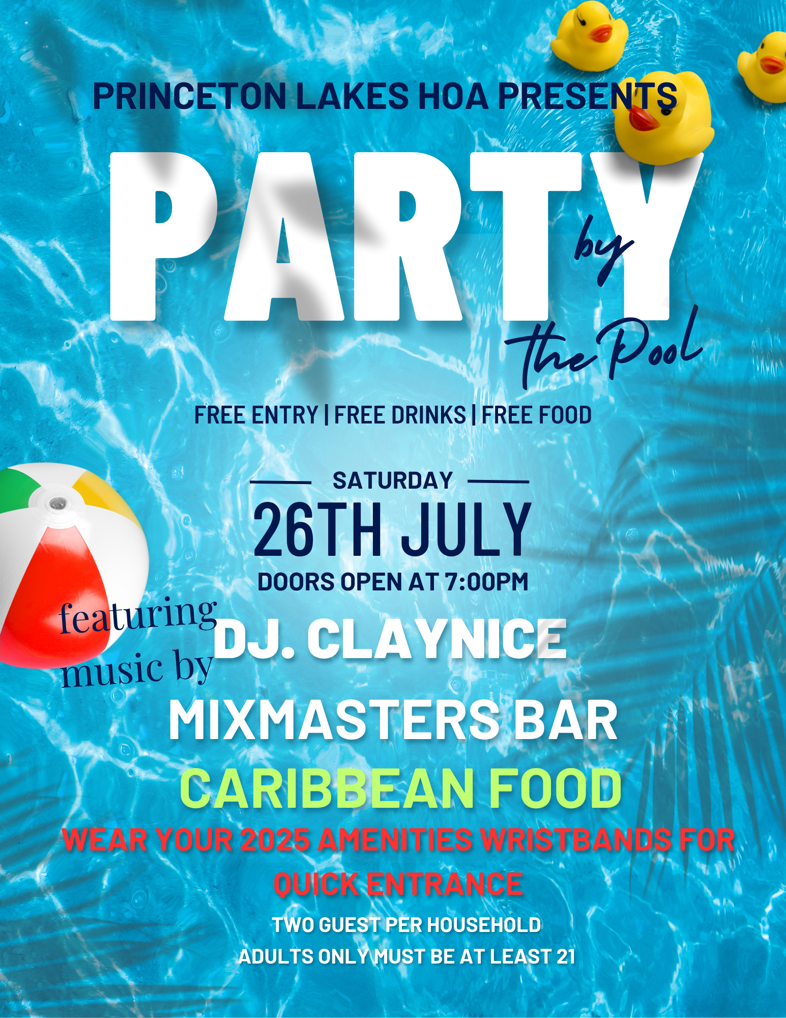 Cool off and groove with us at the Princeton Lakes Clubhouse Pool! Enjoy an unforgettable evening with smooth jazz, a live band, and the electrifying sounds of DJ Claynice keeping the party going. Savor delicious food and refreshing drinks while you mingle with friends and neighbors under the summer sky. Bring your energy, your dancing shoes, and your best poolside vibes—let’s make it a night to remember!